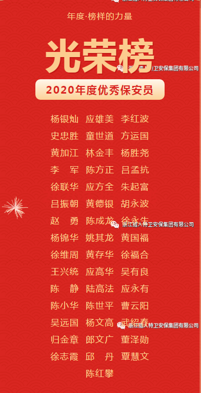 伴隨著新年的鐘聲,帶著難忘的記憶,我們走過了碩果盈枝的2020年,邁入了充滿希望、奮發進取的2021年。時序更替,留下的是奮斗者的足跡。過去的一年我們風雨同舟,公司涌現出了一大批主動作為、敢于擔當、表現突出的優秀干部和員工,用真實的行動,詮釋著保安這份職業的責任與擔當,展現了新時代“獵人特衛”人的風采和力量。接下來,讓我們一起回顧2020年公司和員工取得的省、市級各項榮譽和公司表彰。