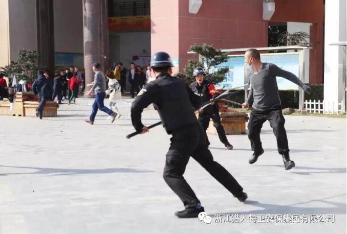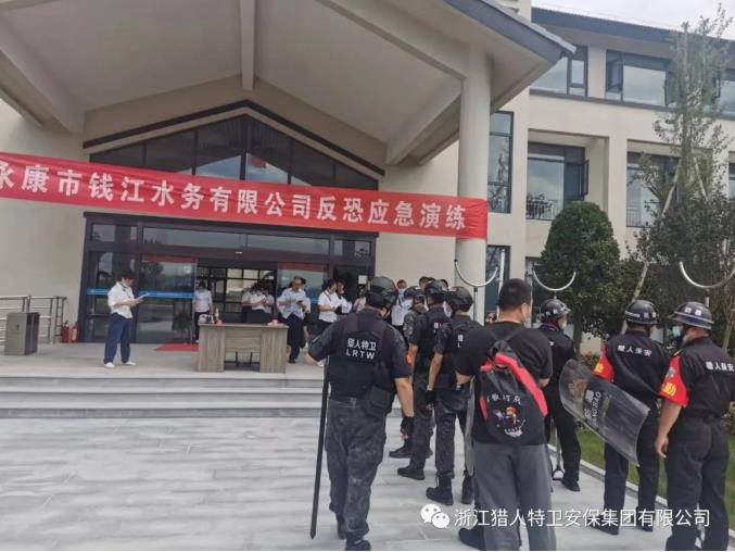演練開始。一群不明身份的外來人員在錢江水務有限公司大門外游蕩,突然掏出棍棒、匕首等對值守保安進行襲擊,并強行沖擊廠區大門,追襲上班職工,值班保安立即按下一鍵報警裝置,并迅速用對講機呼叫緊急增援,內巡邏保安隊員手持防暴盾牌、鋼叉等反恐防暴器械及錢江水務有限公司干職員工隨手提取掃把、棍棒從四周壓制“歹徒”,在有效時間內和“暴徒”展開周旋,為公司各級應急聯勤區保安員、應急機動隊和公安民警趕到現場處理警情爭取時間。