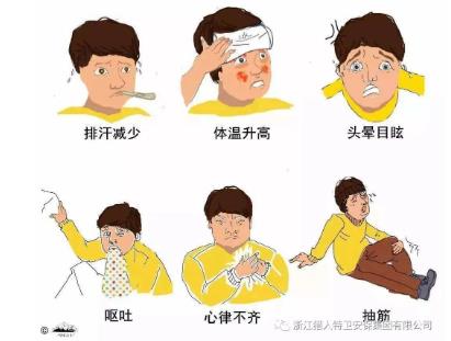 1、先兆中暑:出現(xiàn)大量出汗、口渴、頭昏、耳鳴、胸悶、心悸、惡心、體溫升高、全身無(wú)力。