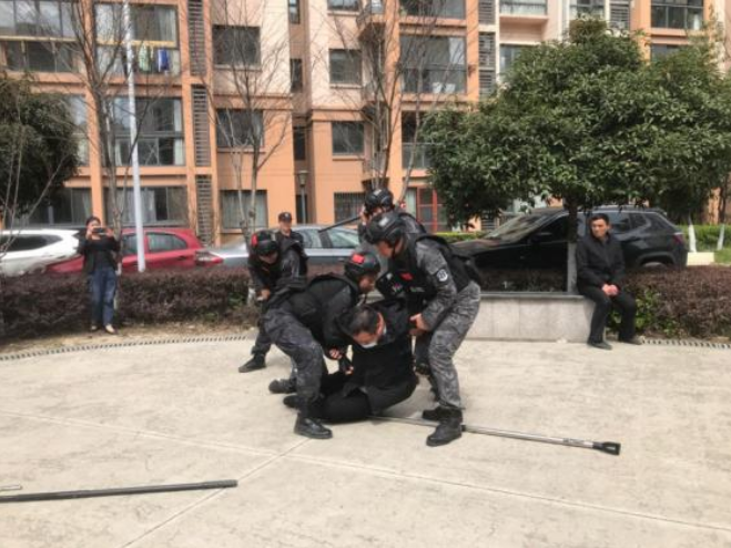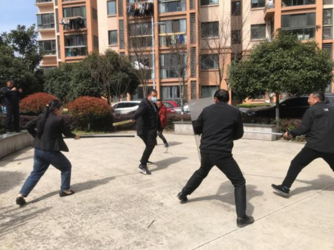 現場模擬一名“歹徒”持刀進入小區(qū)進行砍殺,小區(qū)保安人員第一時間報警并拿起鋼叉、盾牌等器械組成四人戰(zhàn)術小組,與“歹徒”周旋,后將其制服,成功處置突發(fā)事件。