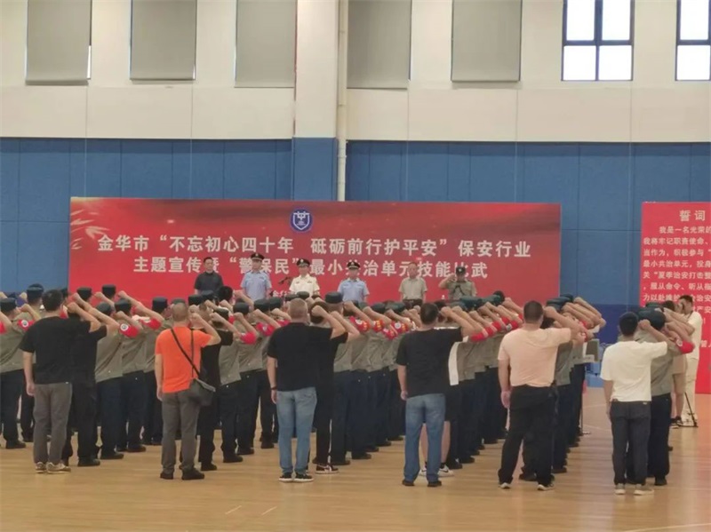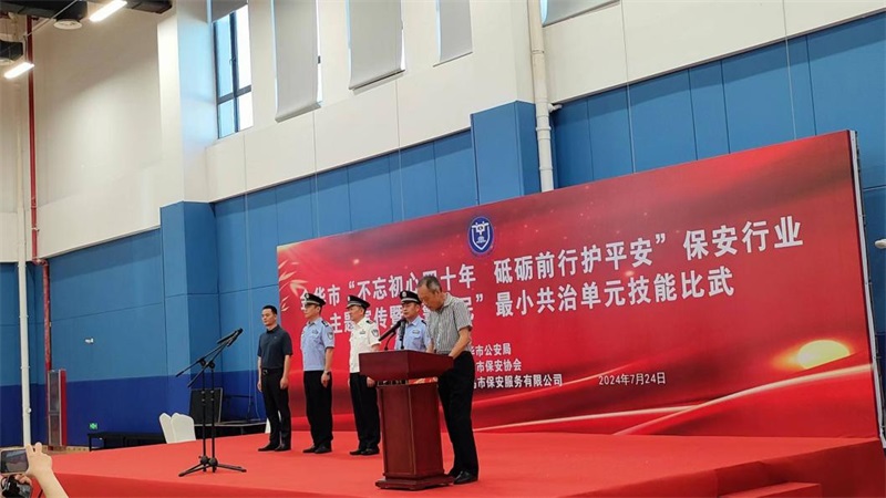 為進(jìn)一步加強(qiáng)保安行業(yè)宣傳、動員廣大保安企業(yè)和保安員積極投身“警保民”最小共治單元建設(shè)。7月24日,由金華市公安局指導(dǎo),金華市保安協(xié)會主辦,義烏市保安服務(wù)有限公司承辦的“不忘初心四十年,砥礪前行護(hù)平安”金華市保安行業(yè)主題宣傳暨“警保民”最小共治單元技能比武大賽在金華市人民警察培訓(xùn)學(xué)校舉辦。金華市公安局黨委委員、副局長呂會民,金華市公安局經(jīng)文保支隊相關(guān)負(fù)責(zé)人出席活動。