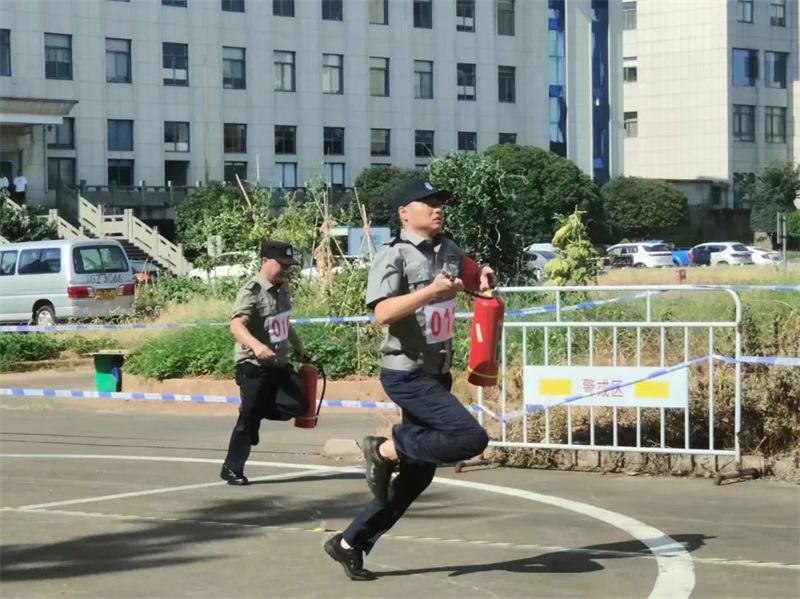 比賽分為理論和技能實操兩個科目。其中,技能實操設(shè)置了團(tuán)隊項目(隊列、棍盾叉處置)和個人項目(油盆滅火、應(yīng)急救護(hù)、安全檢查)。