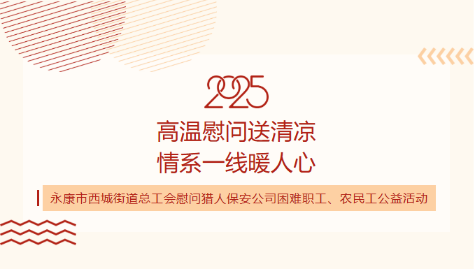 2025年9月19日,炎火夏日,驕陽似火,永康市西城街道總工會帶著滿滿的關懷走進獵人保安公司,為奮戰在一線困難職工和農民工送上米、乳膠涼席、肥皂生活物資,用實際行動傳遞永康市西城街道總工會組織的溫暖與支持。