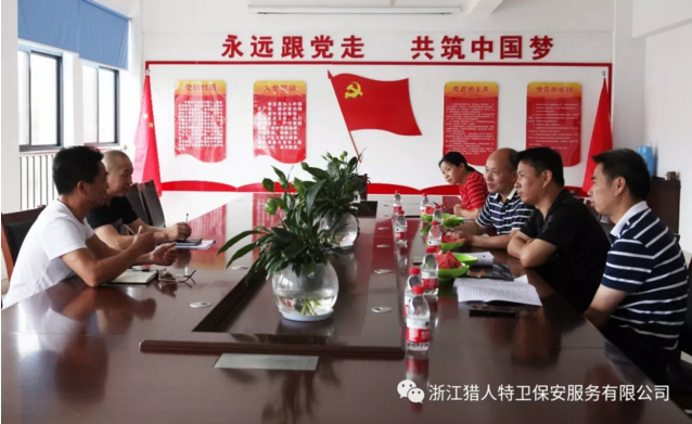 6月20日,磐安縣公安局治安大隊、教育局、財政局領(lǐng)導(dǎo)及磐安縣保安公司總經(jīng)理一行四人來到浙江獵人特衛(wèi)保安服務(wù)有限公司,就校園安保服務(wù)項目所涉及的保安員任職條件審定、保安員崗位安置、保安員隊伍管理、服務(wù)質(zhì)量管理、校園風(fēng)險評估預(yù)防、人防技防的優(yōu)勢互補及發(fā)揮、安保延伸服務(wù)等問題尋求答疑。