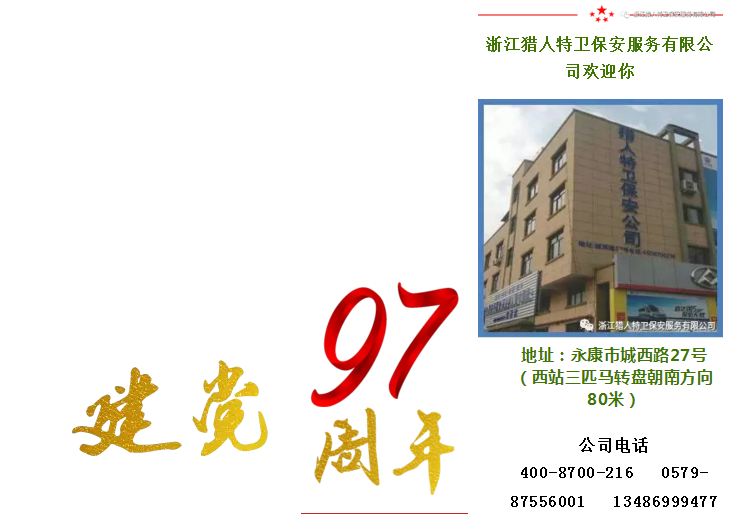 為慶祝中國共產(chǎn)黨成立97周年,謳歌黨的豐功偉績,繼承和發(fā)揚黨的優(yōu)良傳統(tǒng)和作風(fēng),深入推進“兩學(xué)一做”學(xué)習(xí)教育常態(tài)化制度化,浙江獵人特衛(wèi)保安服務(wù)有限公司黨支部陸續(xù)開展了內(nèi)容豐富、主題鮮明、形式多樣的系列活動,獻禮黨的97周年華誕。