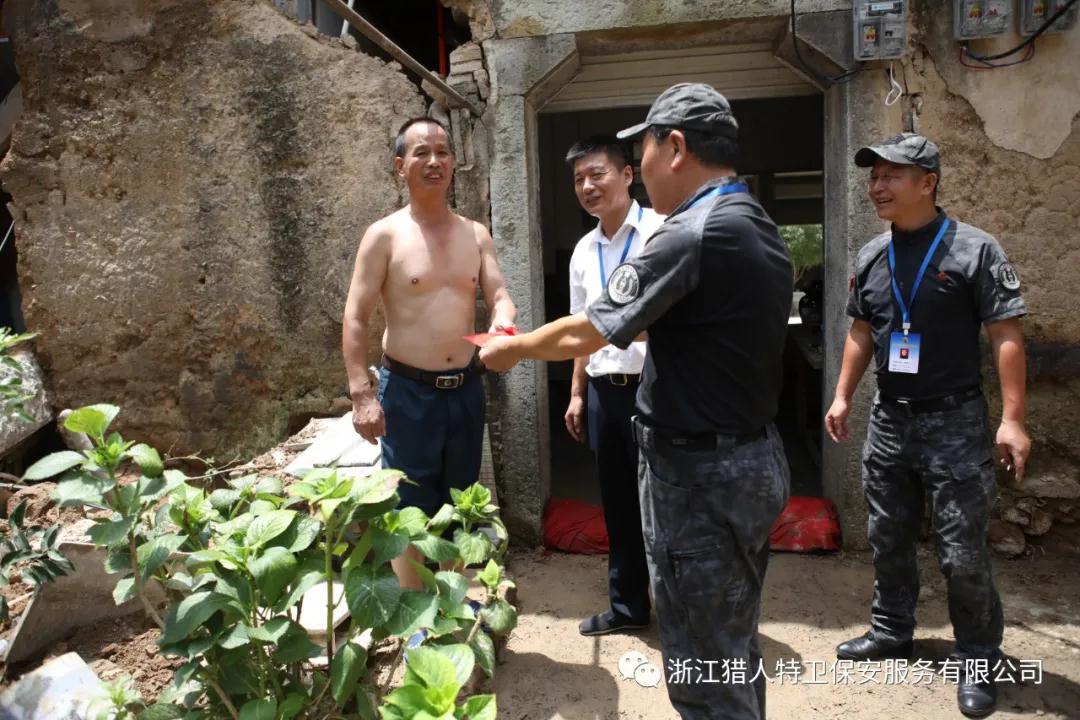 浙江獵人特衛(wèi)保安服務(wù)有限公司董事長董飛躍密切關(guān)注災(zāi)情,時刻牽掛著公司員工及其家屬的安危,公司黨支部、工會通過詳細(xì)了解,在掌握公司員工家庭受災(zāi)情況后,為幫助他們渡過難關(guān),8月10日,由公司常務(wù)副總經(jīng)理盛安華帶隊,帶領(lǐng)黨支部、工會、人防部負(fù)責(zé)人趕赴災(zāi)區(qū)現(xiàn)場,為4名受災(zāi)慘重的員工及其家屬送去溫暖。