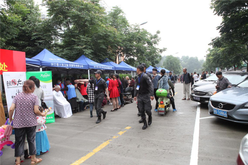 上午10時,在園丁社區北苑小區活動現場,浙江獵人特衛保安服務有限公司與園丁社區工作人員現場提供治安、消防、急救等宣傳和咨詢服務,耐心為居民答疑解惑。