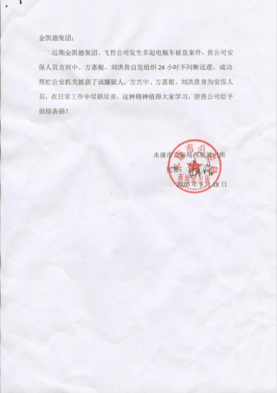 昨天,浙江獵人特衛保安公司接到駐勤單位-- 浙江金凱德集團轉交永康市公安局西城派出所的表揚建議信,同時感謝公司及駐勤保安員的盡心盡責。